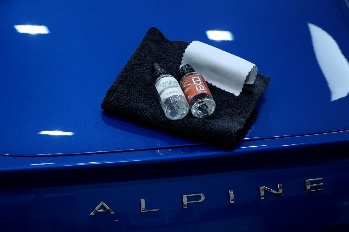 La carrosserie de cet exemplaire d’Alpine A110 a donc reçu un traitement céramique bi-couche GTechniq (Crystal Serum Light et Exo v4) afin d’autoriser une excellente protection anti-Uv et hydrophobe facilitant ainsi considérablement l’entretien. Le vernis est aussi grandement mis en valeur.