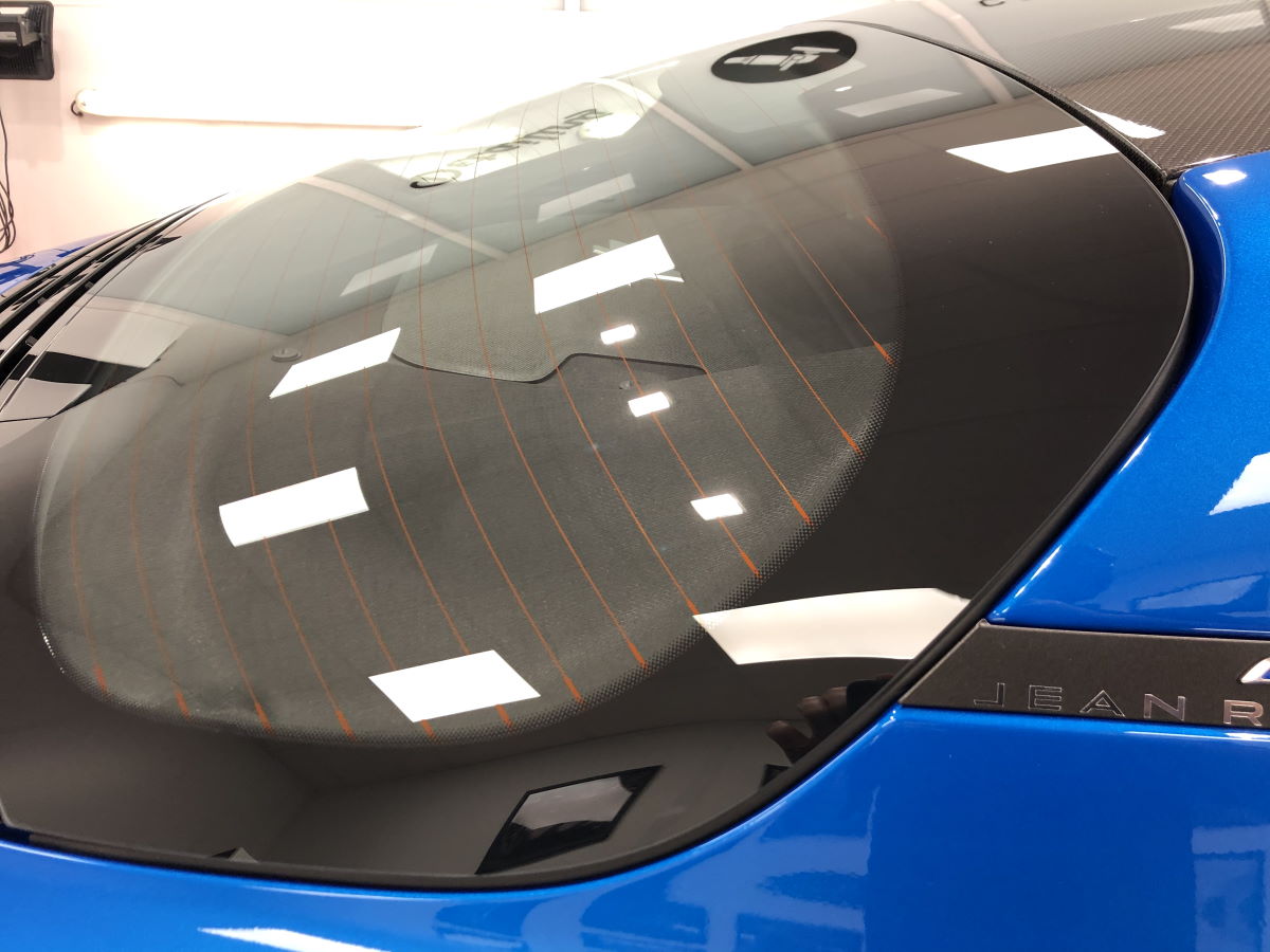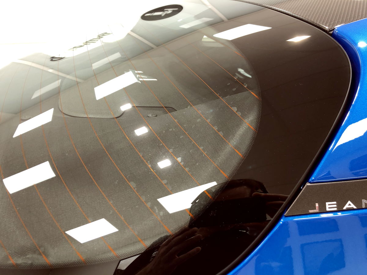 Tout d’abord, la lunette bombé arrière caractéristique. Ici, sur le nouveau modèle, cette lunette est aisément débrayable pour intervenir sur le moteur pour les entretiens classiques. Certaines fois, et c’est souvent le cas sur le nouveau modèle d’Alpine A110, l’étanchéité au niveau du joint périphérique n’est pas top. Ainsi, lors des lavages, de l’eau peut s’immiscer et quelques gouttes apparaitre à l’intérieur de la lunette.